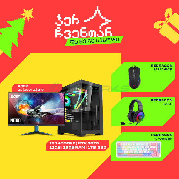 Gaming კომლექტი I5 14600KF | RTX 5070 12GB | 16GB DDR5 | 1TB SSD | 27" 2K 180HZ Monitor | Gaming აქსესუარები