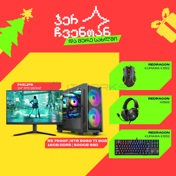 Gaming კომპლექტი R5 7500F | RTX 5060TI 8GB | 16GB DDR5 | 500GB SSD | 24" 180HZ IPS Monitor | Gaming აქსესუარები
