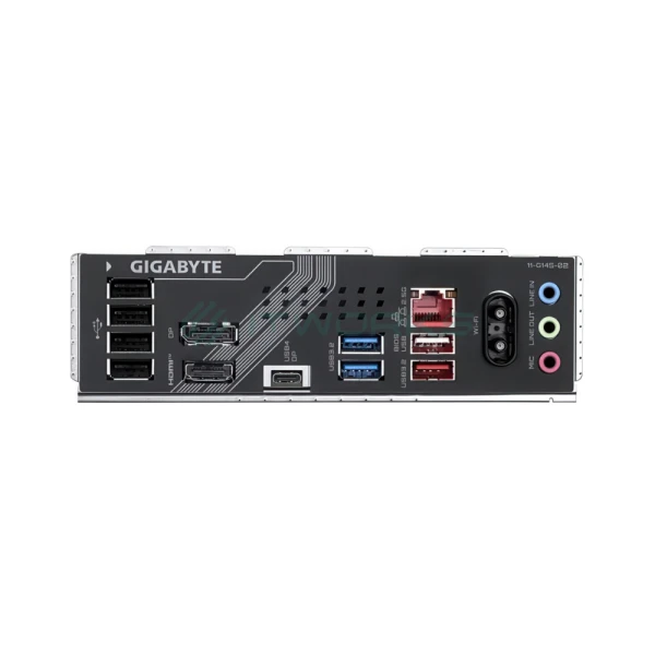 შემომავალი პორტები უკანა პანელზე 1x HDMI port (Note), 1x DisplayPort (Note), 1x USB4® USB Type-C® port (DisplayPort (Note)), 2x USB 3.2 Gen 1 ports, 1x USB 3.2 Gen 2 Type-A port (red), 5x USB 2.0/1.1 ports, 2x antenna connectors (2T2R), 1x RJ-45 port, 3x audio jacks