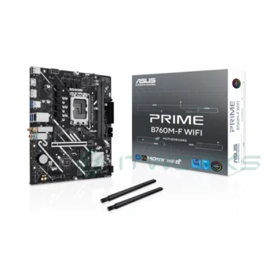 ASUS PRIME B760M-F WIFI, an Intel B760 LGA 1700 micro-ATX motherboard with PCIe 5.0, two PCIe 4.0 M.2 slots, DDR5, WiFi 6, Realtek 1Gb Ethernet, DisplayPort, HDMI, SATA 6 Gbps, front USB 5Gbps ports, Aura Sync (90MB1N00-M0EAY0)